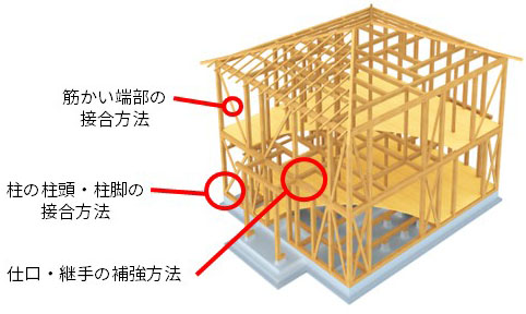 壁量計算の「数値だけが」新耐震基準なだけで、壁の配置バランス、柱頭柱脚(柱の中で、梁と接する上部と、土台やなどに接する下部のこと)の設計など耐震性能が甘かったことが考えられます。