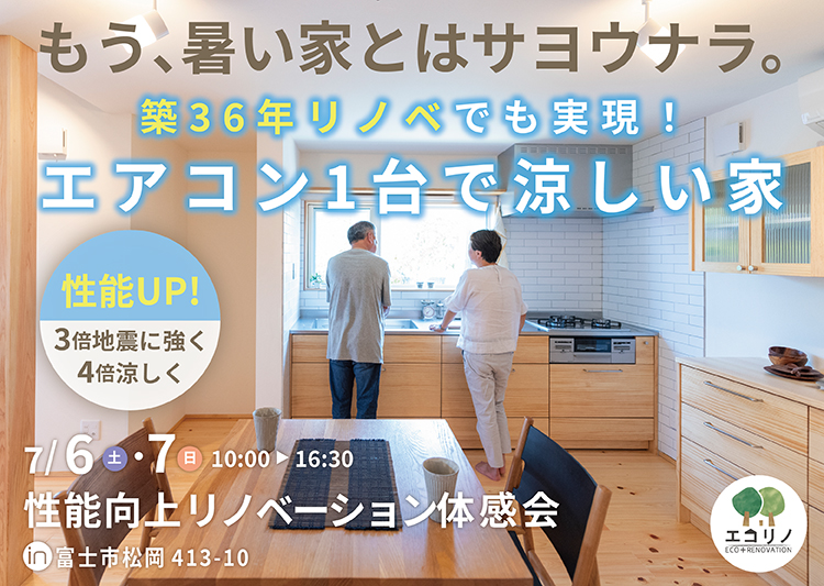 7月6日㈯・7日㈰リノベーション体感会in 富士市松岡『もう、暑い家とはサヨウナラ。築36年リノベでも実現!エアコン1台で涼しい家』