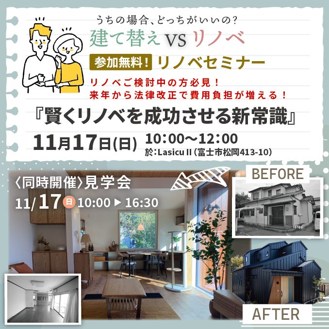 11月17日(日)【参加無料】【個別相談OK!】リノベセミナー『賢くリノベを成功させる新常識』 【同時開催】LasicuⅡ見学会
