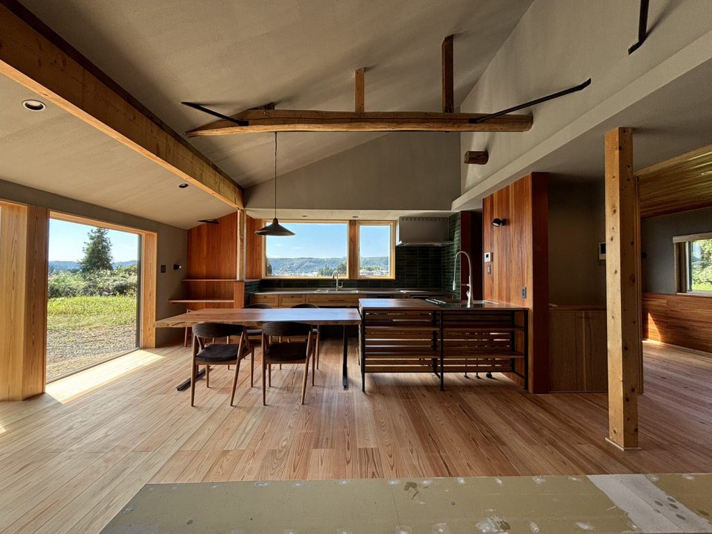 自然の景色や風景、庭の畑が見える壁付けキッチンと、洗い物が楽になるフロントオープン食洗器+対面シンク。