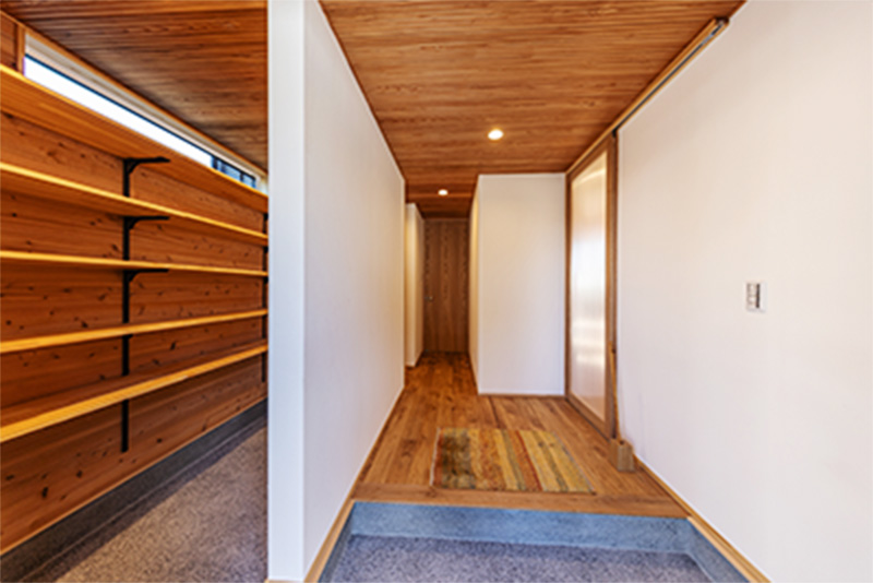 北側の玄関ドアを西側に移動。採光ガラスを採用し、一日中明るい玄関に。ホールの1/3を土間収納にすることで、家族みんなの持ち物がスマートかつ、雨に濡れた物も容易に収納できるように。ワンちゃんが濡れても安心です。