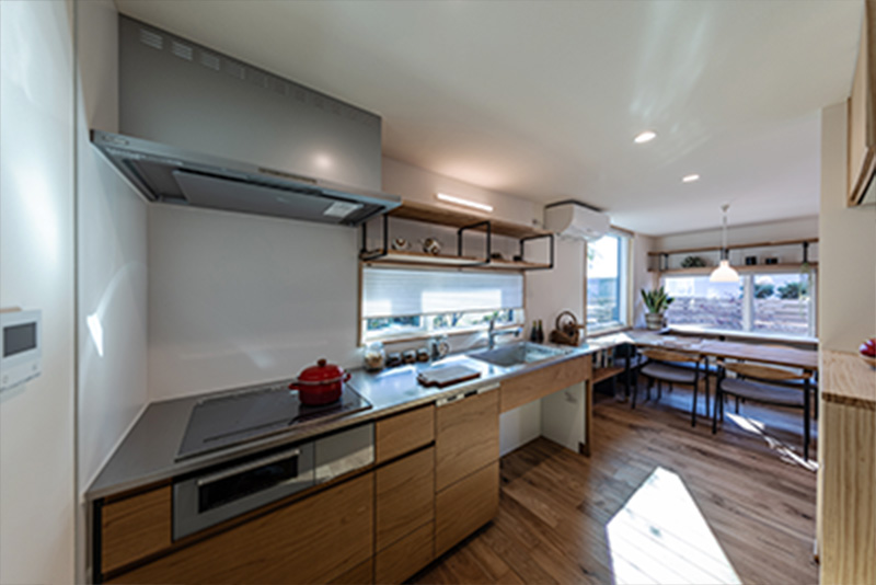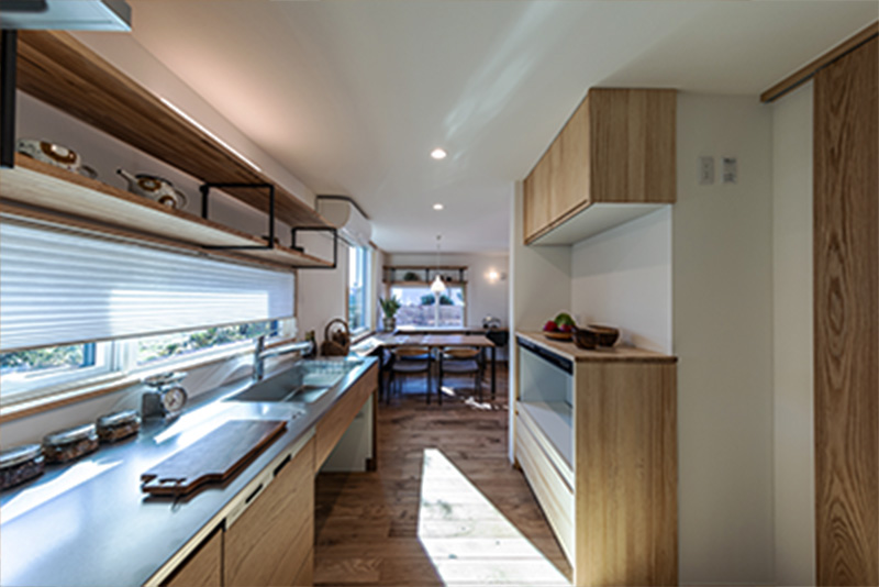 玄関正面にあった階段を、配置は大きく変更せず登り口のみリビングに変更。空気が2階に上がり、家全体が温まります。リビングを通ることで家族間のコミュニケーションも生まれやすい動線です。