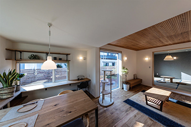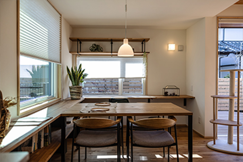 お庭にはウッドチップのドッグラン。雨上がりでも脚が汚れずペットも人間も快適なウッドチップはワンちゃんが安心して遊べる素材を採用。もちろんゲートも完備。日当たりバツグンな南側の窓辺にはキャットウォークを兼ねた造作の収納棚。無垢材の棚板はどの季節も温もりがあり、さらりとして気持ちよい。飼い主さんはカウンターとしても収納としても利用できる万能アイテムです!