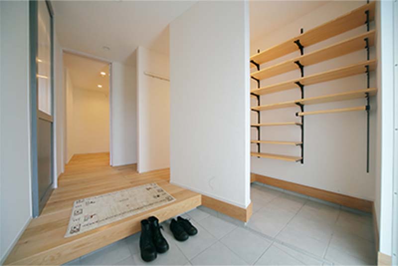 リビングだった場所を玄関に変え、また来客用、家庭用の入口を設けてすっきりとした玄関に生まれ変わった。