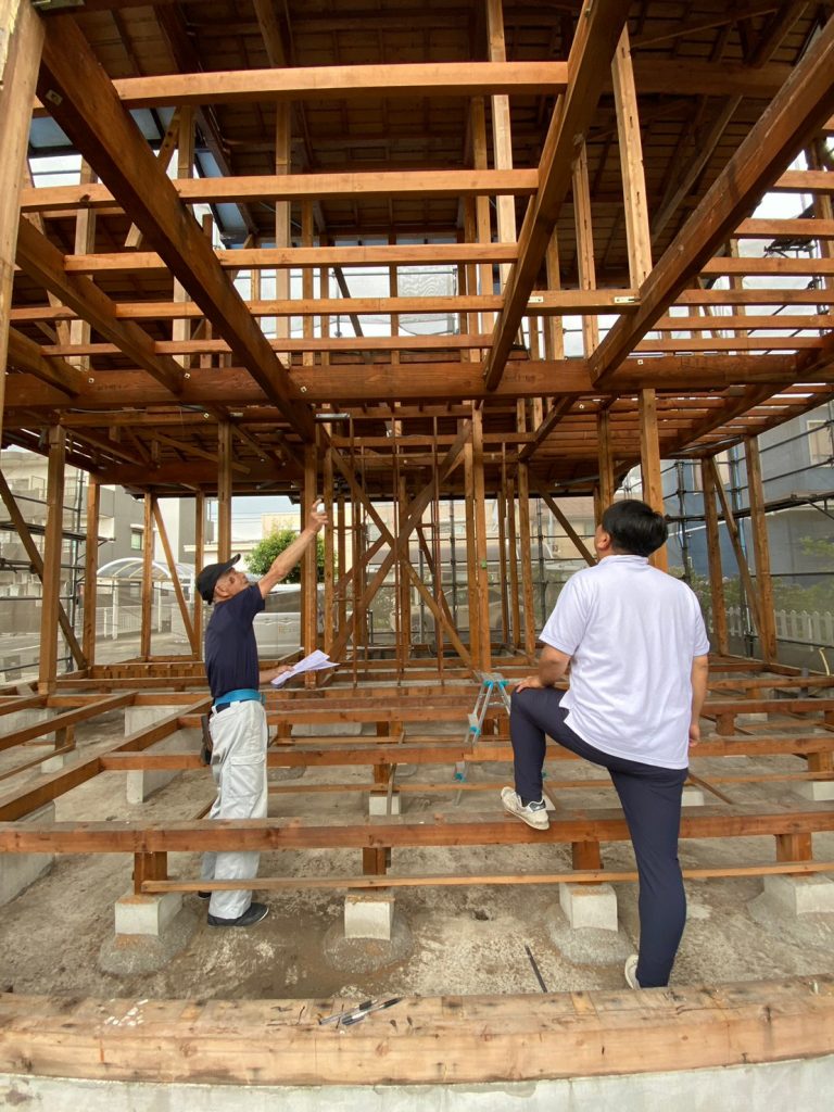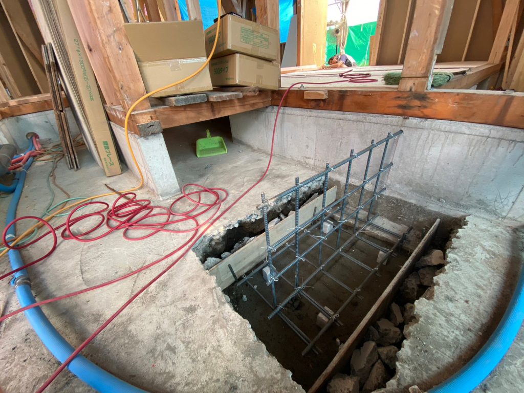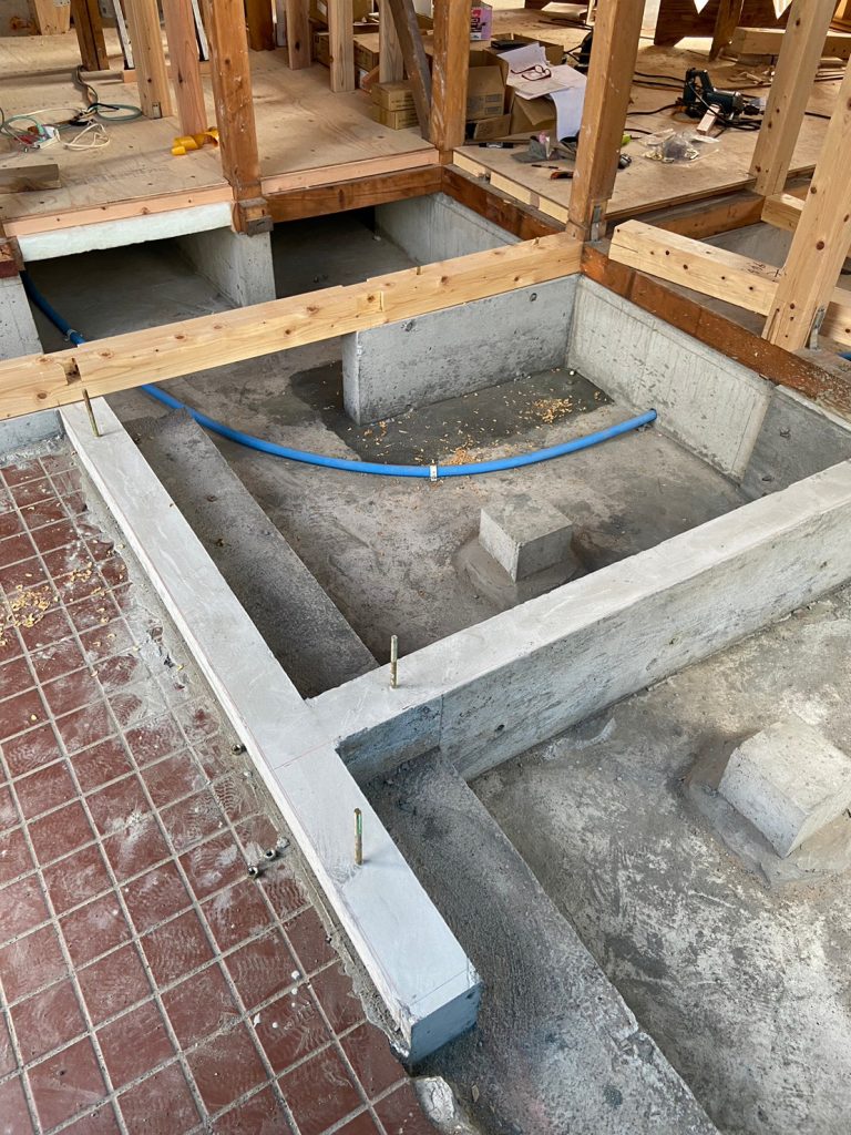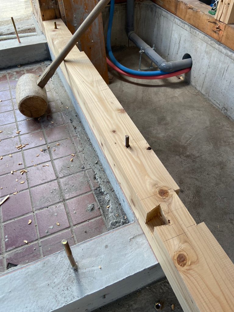 2023.07.31 前回配筋が組まれていた箇所にコンクリ基礎が完成し、大工さんの手仕事で、大引きの施工が行われていました!!