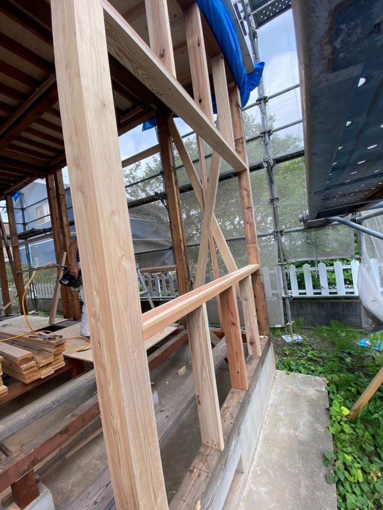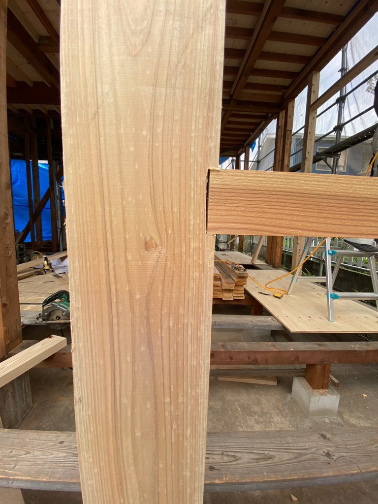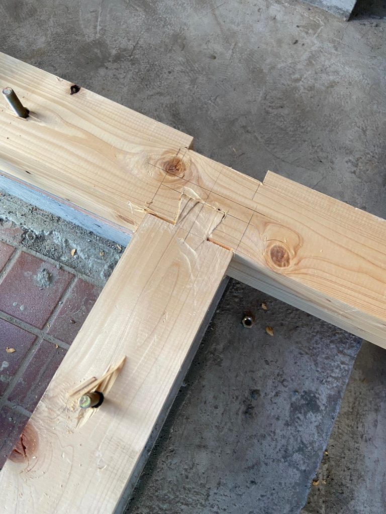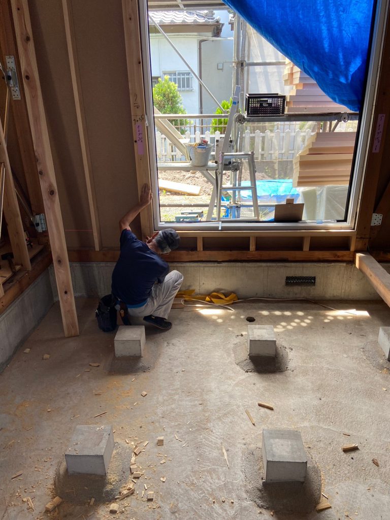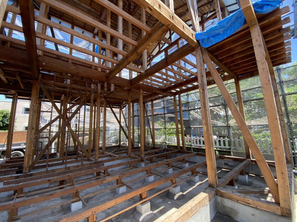 2023.07.31 前回配筋が組まれていた箇所にコンクリ基礎が完成し、大工さんの手仕事で、大引きの施工が行われていました!!