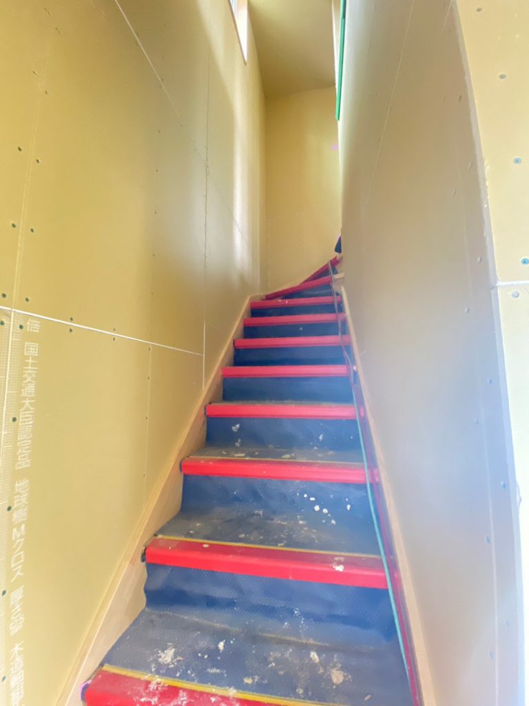 階段が完成していました☆ 養生シートでカバーされていますが、無垢木材の階段です。 階段は意外と人生で使用することが多い場所。 毎日昇降するとかなりの使用回数になります。 階段が完成したので、2階を見ることも出来ましたよ♪