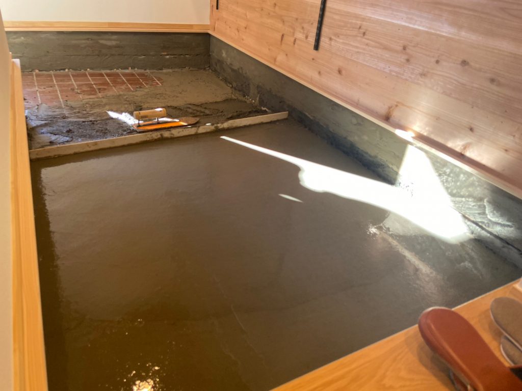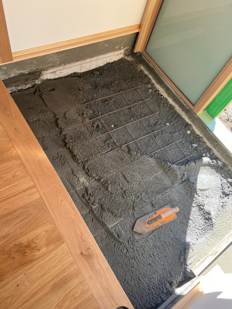 こちらは、下地の上に、コンクリを流し込んでいるところ。 既存のタイル貼りの玄関をそのままに、モルタルで高さをかさ上げします。強度などは心配ないと、きちんと調査済みです!! 見ているだけではわからない、難しい施工です。 あっという間にモルタルが流されて、きれいに端から木の棒で整えて、。。
