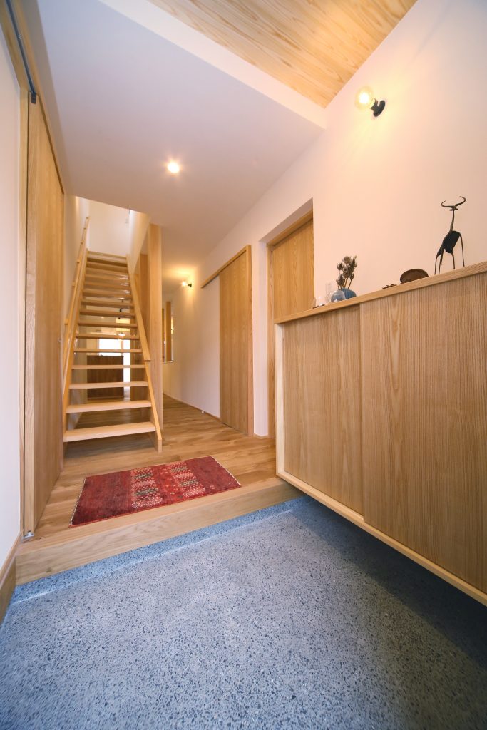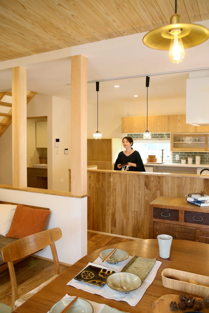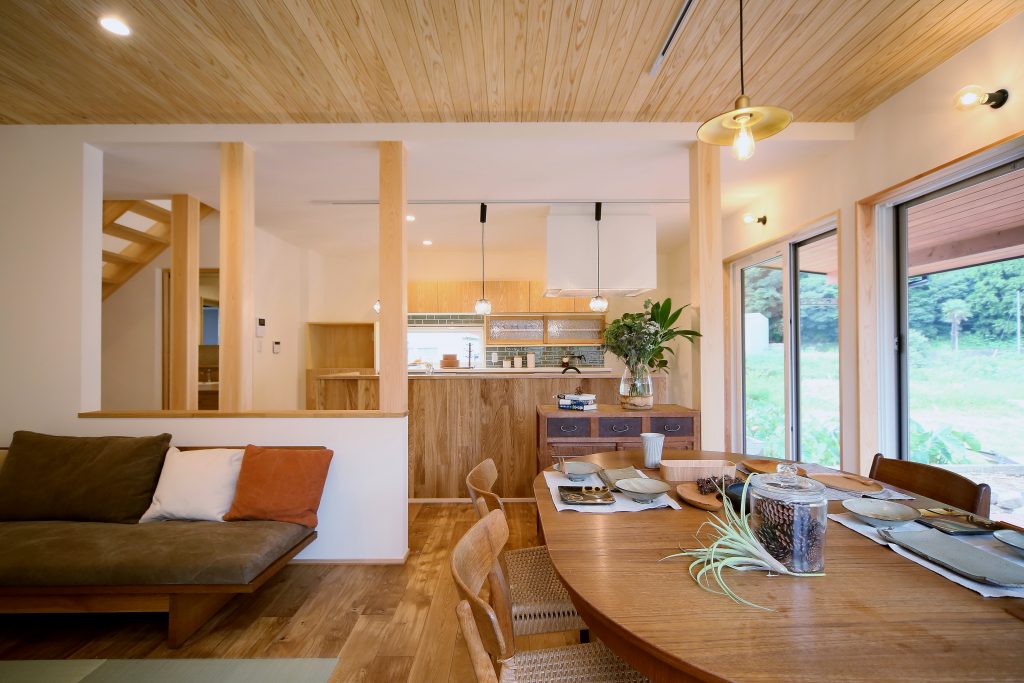 無垢のオークを床に施工し、天井も一部板張りにしています。木に包まれた心地いいLDKです。