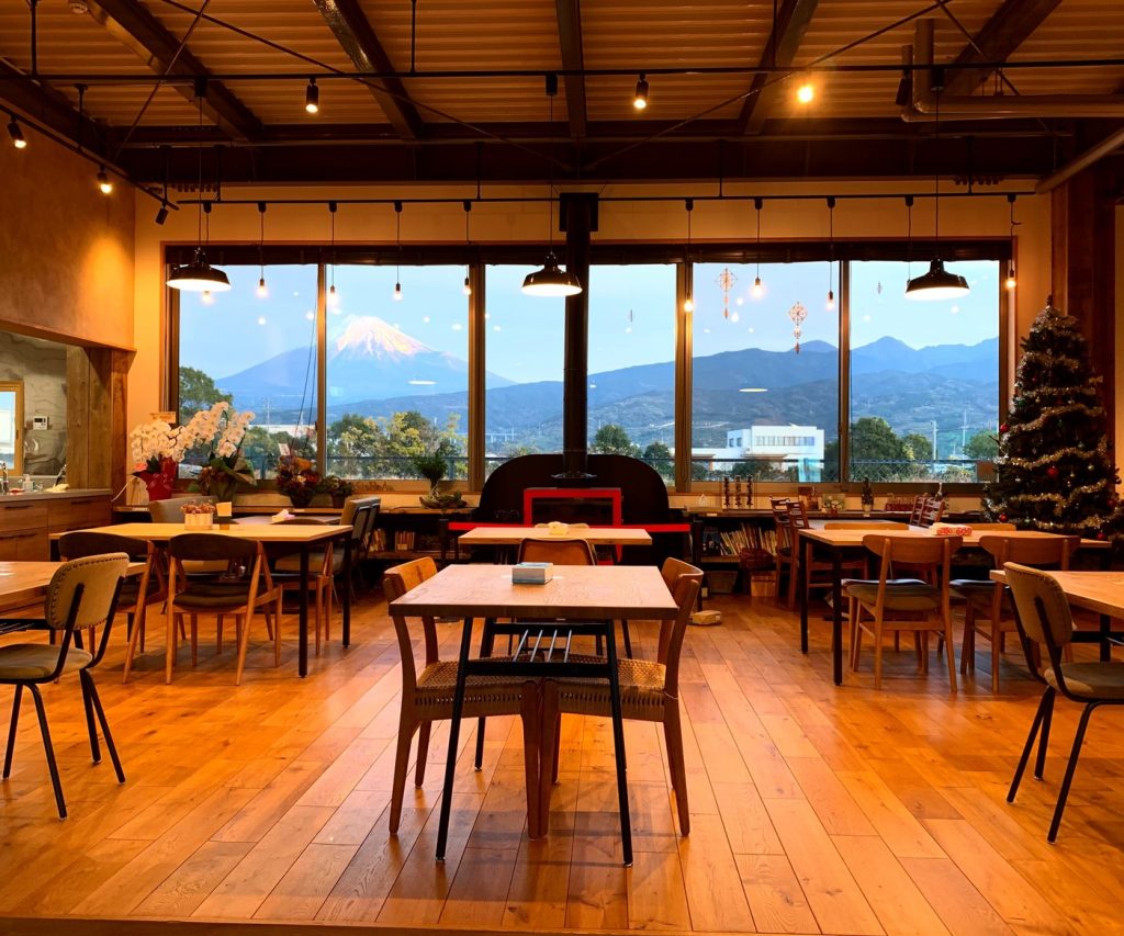 富士山の見える絶好なカフェスペース。四季折々の風景を楽しみながらおいしい珈琲を飲めますよ。