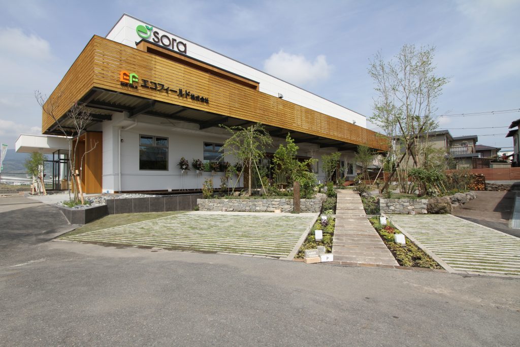 2015年に事務所を移したエコフィールド。ここは元々スーパーの物流倉庫でした。1階にはカフェ、ショールームが完備され、地域の人々に愛される場所となりました。また、ギャラリーも設けられ、デザイナーや作家など多くの方にご利用いただいて作品を展示しています。2階は模型やサンプル展示スペース、会議室、事務室が完備され、落ち着いた環境で仕事に励むことができます。2019年12月にはカフェ『至福のフルーツパフェ物語』がオープンし、連日若い女性やママさん達の憩いの場となっております。