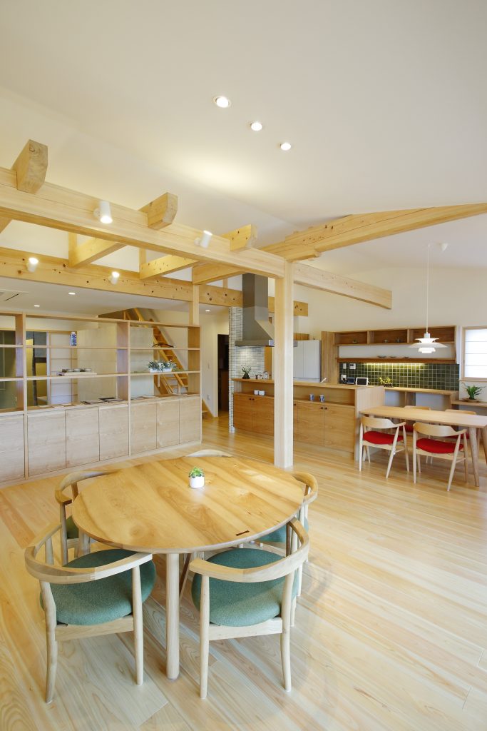 平屋の2人住まいをテーマにしたおおらかなワンルームのショールーム。桧の無垢の床、ホタテ塗り壁などエコフィールドの標準仕様をご体感することができます。